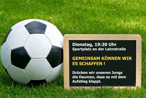 Helfen wir ihnen dabei! Pilgern wir am Dienstagabend alle zur Lahnstraße, um die Elf mit gedrückten Daumen an der Außenlinie zu unterstützen! Gemeinsam können wir unser Ziel erreichen!