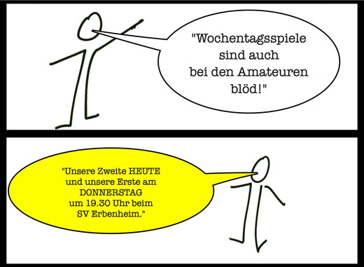 Doch: Ohne Spiele unter der Woche geht’s nicht und so muss heute Abend unsere Zweite Mannschaft und am Donnerstag die Erste beim SV Erbenheim antreten.
