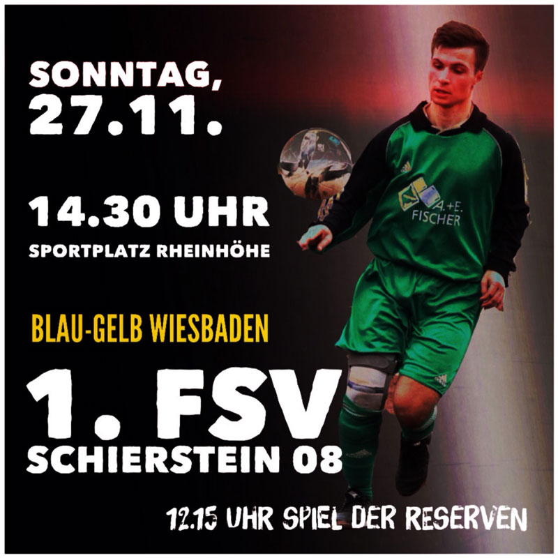 2016_11_23 (HG) Und wieder geht es Richtung Waldstraße! Dieses Mal ist der Platz auf der Rheinhöhe das Ziel unserer Ersten und Zweiten Mannschaft. Beide Teams bekommen es dort am Sonntag mit dem SV Blau-Gelb Wiesbaden zu tun. Die Erste der "Blau-Gelben" liegt als A-Liga-Neuling recht gut im Rennen und belegt aktuell den achten Tabellenplatz. Das Team will weiter nach oben und konnte – so unsere Informationen – zwei neue Spieler an Land ziehen, die zuletzt in der bayerischen Verbandsliga gespielt haben.