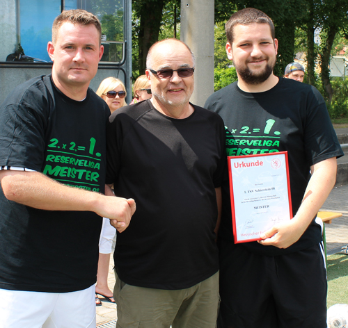 Klassenleiter Ingo Jungk übergibt die Meisterschaftsurkunde an Marcus Radu (links) und Marcel Stumm (rechts)