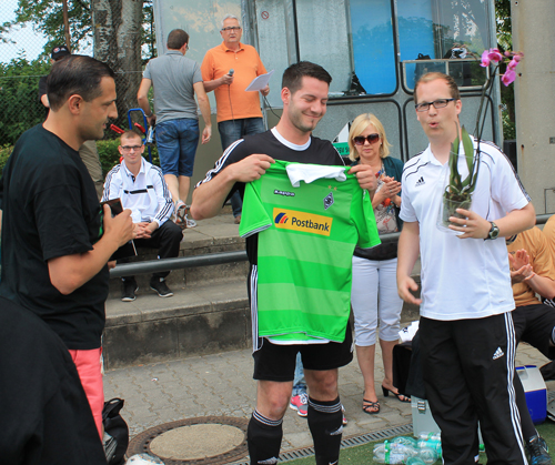 Blümchen und Gladbach-Fan-Trikot für Thomas Gommert (rechts), überreicht von Sven Lauterbach.