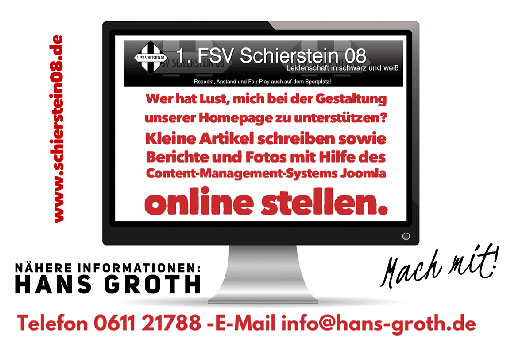 Und wenn es in Sachen Schierstein 08 etwas Neues gibt, dann melde ich mich! Für Neuigkeiten aus dem Verein und für den Versand von Einladungen habe ich einen NEWSLETTER eingerichtet. Der erste wurde vor wenigen Tagen allen Mitgliedern, von denen ich eine E-Mail-Adresse habe, mit dem obigen Inhalt zugestellt. Wer den Newsletter nicht bekommen hat und in den Verteilerkreis aufgenommen werden will, kann sich mit dem nachstehenden Formular anmelden.