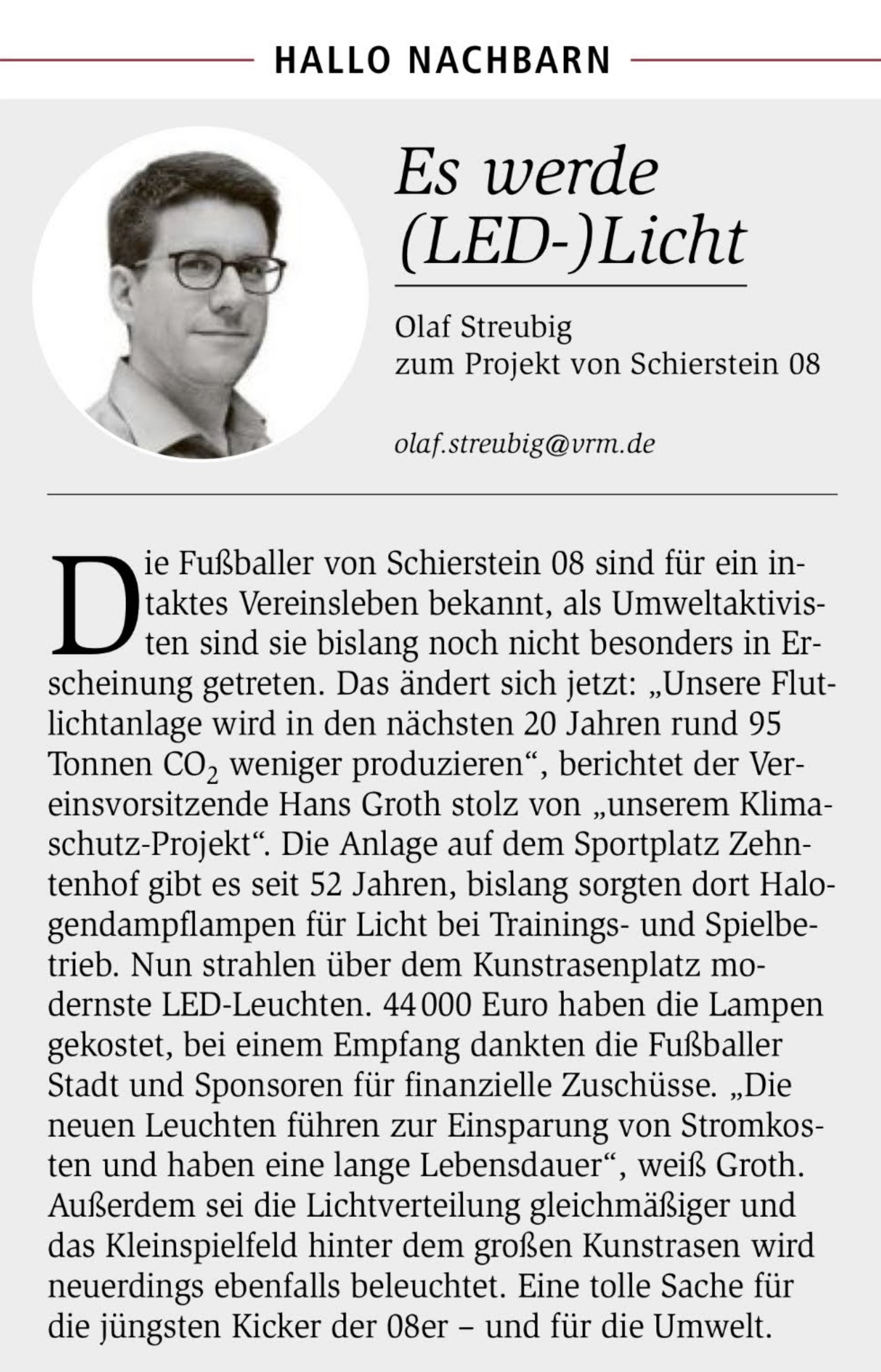 Mit einem kleinen Empfang am Donnerstagabend im Vereinsheim konnten die Nullachter ihr Klimaschutz-Projekt „Ausstattung der Flutlichtanlage mit LED-Leuchten“ erfolgreich abschließen. Für den Vorsitzenden der Nullachter Hans Groth war es ein Herzensbedürfnis, sich bei allen Personen persönlich zu bedanken, die mit einer finanziellen Zuwendung zum Gelingen des 44.000,00 Euro teuren Projektes beigetragen haben.