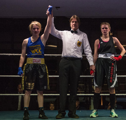 wurde in der Gewichtsklasse "Federgewicht" Hessenmeisterin! Mit einem technischen K.O. setzte sich Denise gegen Michelle Lerch aus Lampertheim durch und konnte sich so gemeinsam mit ihren Trainern und Betreuern vom 1. Wiesbadener Amateur-Box-Club über diesen großartigen Sieg freuen! Wir gratulieren Denise auf das herzlichste und wünschen ihr weiterhin viel Erfolg. Auf dem Fußballplatz und im Boxring!