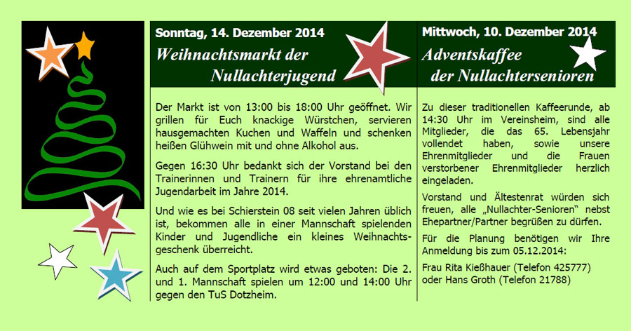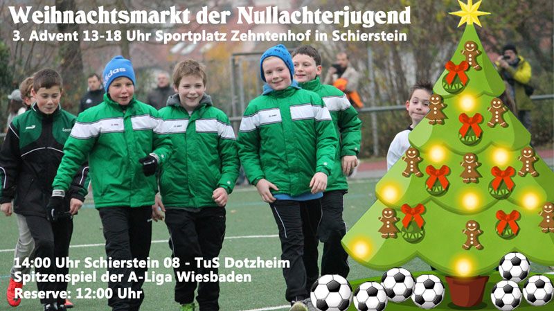 Hochbetrieb am Zehntenhof. Zum einen stehen um 12:00 und 14:00 Uhr die A-Liga-Begegnungen der Ersten und Zweiten Mannschaft gegen den TUS Dotzheim auf dem Programm, zum anderen sind alle Mitglieder und Vereinsfreunde zu einem vorweihnachtlichen Treffen unterm Tannenbaum eingeladen. Cheforganisatorin Rita Kießhauer hat gemeinsam mit ihrem „Jugendteam“ den Tag bestens vorbereitet. Die Vereinswirtin: „Kaffee, Kuchen, Waffeln, Leckeres aus der Küche, kalte und heiße Getränke mit und ohne Alkohol, eine kleine Verlosung sowie die eine und andere Überraschung warten auf die Gäste!“