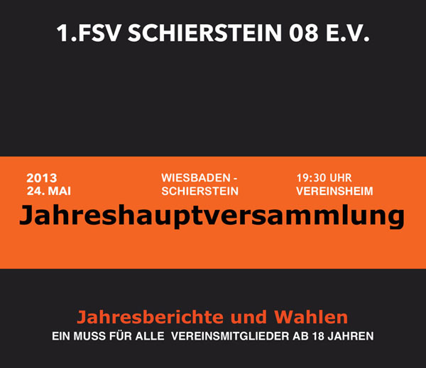 Liebe Vereinsmitglieder, zu der am Freitag, 24. Mai 2013 um 19:30 Uhr im Vereinslokal Erich Richter auf der Sportanlage „Am Zehntenhof“ in Wiesbaden-Schierstein stattfindenden Jahreshauptversammlung laden wir unsere Vereinsmitglieder herzlich ein. Stimmberechtigt sind gemäß § 15 unserer Vereinssatzung alle Mitglieder, die das 18. Lebensjahr vollendet haben! Die Eltern unserer jugendlichen Mitglieder sind ebenfalls herzlich willkommen! Tagesordnung